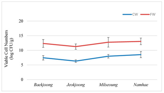 Viable cell numbers of cooked wheat and fermented wheat. Error bars (mean ± SD) represent significant differences among the treatments. The data were analyzed with a one-way ANOVA followed by Duncan multiple range tests (p < 0.05). CW: cooked wheat, FW: fermented wheat.