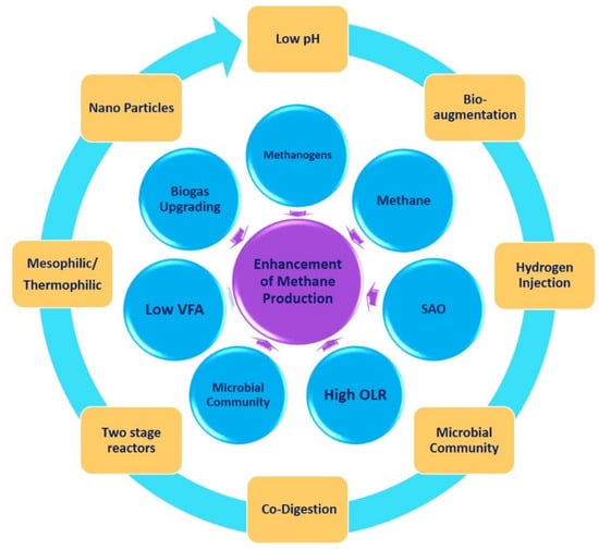 The system pH is often affected by various stress conditions related to change in organic loading, environmental conditions, substrate characteristics, presence of toxic compounds, etc. []. VFA accumulated during start-up resulting in system imbalances is usually due to the insufficient methanogenic population to convert these acids into methane at the same rate that they are produced. The main factors that may help to improve the performance of the anaerobic digestion system and methane production are shown in Figure 1.