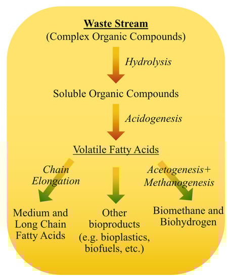 Volatile fatty acids (VFAs) are one of the ready-to-market bio-based products. These are extensively used in several industries [,]. Nevertheless, their main production route depends on chemical synthesis []. Only around 1–10% of VFA is produced by fermentation [].