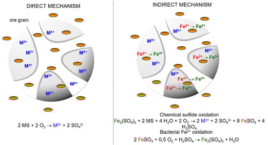 Up to now, there have been two main known mechanisms responsible for bioleaching by S- and Fe-oxidizing bacteria (Figure 3). The direct mechanism is carried out by direct contact of bacteria and metal-bearing material using bacterial enzymes as bioleaching agents []. This mechanism was demonstrated for sulfidic ores; however, it was not recorded for waste material. The most common is the indirect mechanism where microorganisms mobilize metals through the oxidation of ferrous to ferric iron and the oxidation of elemental or sulfidic sulfur to sulfuric acid. Sulfuric acid production improves overall process efficiency. For example, Dorado et al. (2012) pointed out the fact that the H+ ions concentration decreased at the beginning of the chalcopyrite bioleaching process, due to the acid consumption during the protonic attack enabling acidic dissolution of the chalcopyrite []. They reported, e.g., 50% of total copper recovery under most acid conditions (pH 1.5), 15% in the slightly acid conditions (pH 4), and practically negligible at close to neutral conditions (pH 6). Ferric iron is a strong oxidizing agent oxidizing elemental or sulfidic sulfur to sulfuric acid and forming water soluble metal sulfates—Equation (1)—or in the case of waste, oxidizing metallic form into soluble metal ions—Equation (2):