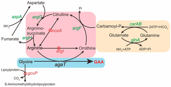 In the ornithine cycle, argininosuccinate synthase (EC: 6.3.4.5) and argininosuccinate lyase (EC: 4.3.2.1), encoded by argG and argH, respectively, are on a gene cluster that promotes the production of arginine from citrulline. Overexpression of argG and argH would increase the metabolic flux of the ornithine cycle. Aspartate ammonia-lyase (EC: 4.3.1.1), encoded by aspA, catalyzes the conversion of fumarate to aspartate, providing aspartate required in the ornithine cycle [24]. We overexpressed argG and argH in strain B6-2 under the regulation of the Promoter Pveg, resulting in strain B8. After 20 h of whole-cell catalysis, the production of GAA was 2.45 g/L (Figure 4b). Meanwhile, we overexpressed aspA on strain B7 under the regulation of the Promoter Pveg, resulting in strain B9. The GAA production was only 0.92 g/L, suggesting that overexpression of aspA alone did not promote the synthesis of GAA (Figure 4b).