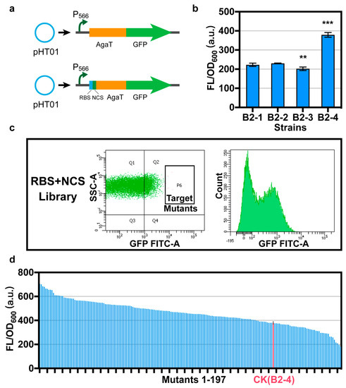 Optimizing RBS and NCS of agaT. (a) In order to optimize the RBS and NCS of agaT, we attached a gfp after agaT through a linker. Please refer to Table 3 for the starting sequence of RBS and NCS. (b) The relative fluorescence intensity of strains B2-1, B2-2, B2-3, and B2-4 under the control of different promoters. (c) Screening of the random mutant library for efficient mutant using flow cytometry. SSC-A: granularity, FITC-A: GFP fluorescence. (d) Characterization of 197 strains obtained from the library. We detected the relative fluorescence intensity of the 197 strains. Data are shown as mean ± S.D. from three (n = 3) biological replicate experiments, and significance determined from Student’s t-test, where ** p < 0.005, *** p < 0.0005, and N.S. = not significant.