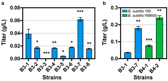 (a) The whole-cell catalysis results in the eight best mutants. (b) The whole-cell catalysis results in B. subtilis WB600 and B. subtilis 168. Data are shown as mean ± S.D. from three (n = 3) biological replicate experiments, and significance determined from Student’s t-test, where * p < 0.05, ** p < 0.005, *** p < 0.0005, and N.S. = not significant.