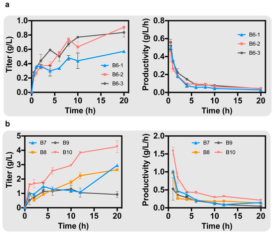 After searching for metabolic pathways of B. subtilis, we found that arginine and citrulline interconvert in the ornithine cycle of B, which is catalyzed by the Nitric-Oxide synthase encoded by nosA. Next, we knocked out the above two or three genes simultaneously. ArgI and gcvP were simultaneously knocked out on the basis of strain B4-2 to obtain strain B6-1. On the basis of strain B4-2, argI and nosA were simultaneously knocked out to obtain strain B6-2. On the basis of strain B4-2, argI, gcvP and nosA were simultaneously knocked out to obtain strain B6-3. The best strain was B6-2, with a titer of 0.91 g/L; the titer of B6-1 was 0.57 g/L, and the titer of B6-3 was 0.84 g/L (Figure 4a). Strain B6-3 had the highest productivity of GAA at 0.56 g/L/h (Figure 4a). The knockout of argI and nosA significantly increased the production of GAA, even better than the simultaneous knockout of argI, nosA and gcvP, suggesting that arginine has a greater effect on GAA biosynthesis than glycine.
