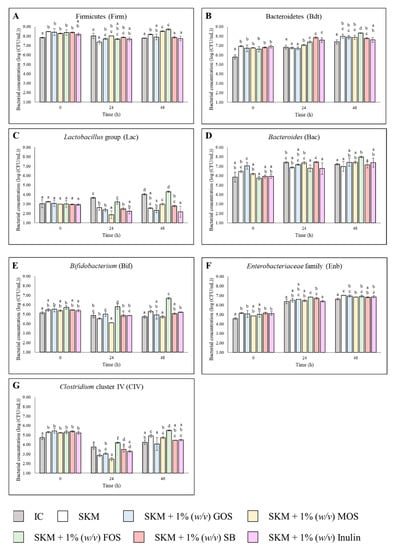 (A–G)—Bacterial quantification (log (CFU/mL), mean ± SD) of the different bacterial populations present in the fecal fermentations for the different condition. (A) Firmicutes (Firm), (B) Bacteroidetes (Bdt), (C) Lactobacillus group (Lac), (D) Bacteroides (Bac), (E) Bifidobacterium (Bif), (F) Enterobacteriaceae family (Enb) and (G) Clostridium cluster IV (CIV). Different letters mark statistically significant (p < 0.05) differences between each condition for each bacterial group at the same sampling time. IC—inoculum control; SKM—skim milk; GOS—galacto-oligosaccharide; MOS—mannan-oligosaccharides; FOS—fructo-oligosaccharides; SB—S. boulardii.