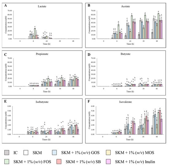 (A–F)—Concentration (mM, means ± SD) of the different organic acids produced during 48 h of fecal fermentation: (A) lactate, (B) acetate, (C) propionate, (D) butyrate, (E) isobutyrate and (F) isovalerate. Different letters mark statistically significant (p < 0.05) differences between each condition at the same sampling time. IC—inoculum control; SKM—skim milk; GOS—galacto-oligosaccharide; MOS—mannan-oligosaccharides; FOS—fructo-oligosaccharides; SB—S. boulardii.