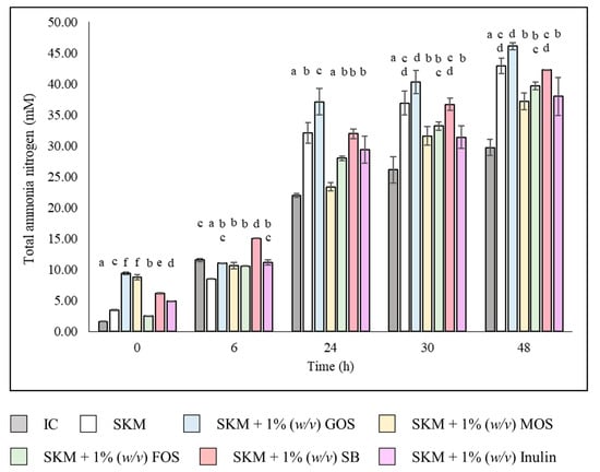 From the tested functional ingredients, at 48 h, SKM + MOS, + FOS and +inulin, were the conditions with the lowest concentrations of total ammonia nitrogen, i.e., 36.7 mM, 39.4 mM, 37 mM, respectively (p < 0.05).
