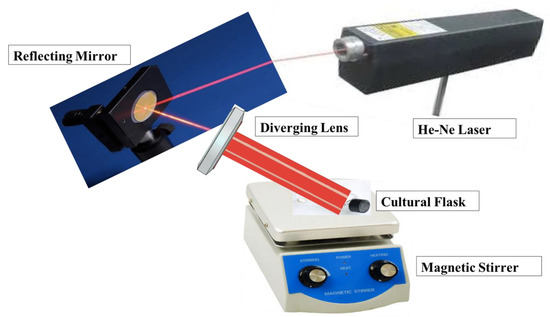 Ten milliliters of bacterial culture with an optical density of 0.6 placed in a small cultural flask were irradiated at 3, 6, and 12 J/cm2 after calculating the required irradiation times. The cultural flasks were placed on a magnetic stirrer to ensure uniform and coherent laser irradiation, as shown in Figure 1. The laser beam was diverged by a suitable diverging lens to ensure that the bacterial culture that lay beneath was fully covered by the laser beam.