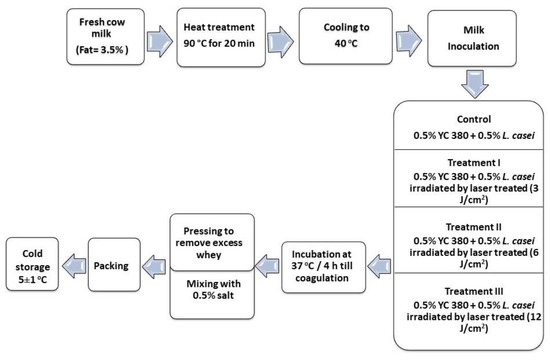 Fresh cow’s milk was heated to 90 °C for 20 min, cooled to 40 °C, and then divided into four equal portions. The first portion served as the control, where the milk was inoculated with 0.5% YC-380 and untreated 0.5% L. casei. The second, third, and fourth portions were inoculated with 0.5% YC-380 and laser-treated 0.5% L. casei with 3 J/cm2, 6 J/cm2, and 12 J/cm2 respectively. The milk was incubated at 37 °C for 4 h until complete coagulation. The resultant coagulant was mixed thoroughly with 0.5% NaCl (Figure 2). Samples were collected for analysis either fresh (day 1) or during the twenty days of cold storage [20].