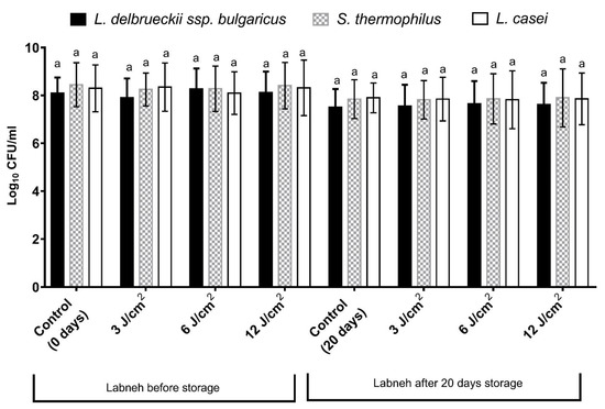 The cold-storage of different dairy products has a negative effect on the viability of different probiotic strains, as previously observed in fermented milk [26,37], bio-yogurt [38], labneh [29,31], and a wide range of cheeses [39]. Figure 3 shows a decrease (not significant) in the viability of L. delbrueckii ssp. Bulgaricus, S. thermophilus, and L. casei strains in both the control and treated samples. The viable counts of L. casei were above 106 CFU/g, as the recommended level for probiotics [40]. At the end of cold storage, there was no significant difference between the counts of L. casei in the control samples and laser-treated samples. Laser treatment did not have any negative effect on the viability of L. casei, which is in line with the results demonstrated in a previous study on L. acidophilus and L. reuteri irradiated at a 660 nm wavelength with different dosages of 1, 5, and 10 J/cm2 [41].