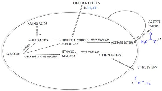 In conclusion, the amount of esters produced by yeast depends on factors that regulate the amount of CoA in wine (Figure 1). There is also evidence for the association of some specific amino acids with CoA biosynthesis [,,]. The level of gene expression is not the limiting factor for ester production. The availability of MCFA precursors plays an important role along with acyl transferase enzymes in ester formation by yeast [].