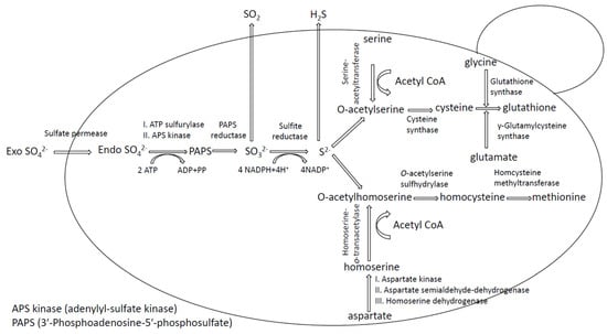 H2S can be metabolically formed by wine yeast from either inorganic sulphur compounds such as sulphate and sulphite or organic sulphur compounds such as cysteine or glutathionine (Figure 2) [,,,]. In general, grape must is deficient in organic sulphur compounds, and this can trigger the yeast to synthesise these sulphur compounds from inorganic sources that are usually abundant in grape must. In S. cerevisiae, H2S is the product of the sulphate reduction sequence (SRS) pathway. In the SRS pathway, H2S is derived from the HS− ion, a metabolic intermediate in the reduction of sulphate or sulphite needed for the synthesis of organic sulphur compounds. If during fermentation these reactions proceed in the presence of a suitable nitrogen supply, the HS− ion is sequestered by O-acetyl serine and O-acetyl homoserine, derived from nitrogen metabolism, to form organic sulphur compounds such as methionine and cysteine [,,]. However, if nitrogen sources are insufficient or unsuitable, free H2S can accumulate in the cell and diffuse into the fermenting must [,,,,].