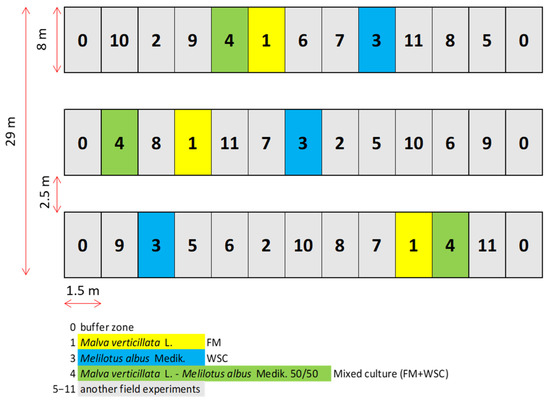 Two crops (Malva verticillata L. and Melilotus albus Medik.) were cultivated either as a monoculture or as a mixed culture to produce shreddings for preparing silage for the biogas plant. Individual variants were grown in a randomized complete block design (8 × 1.5 m), each in triplicate. The arrangement of experimental variants is shown in Figure 1. Before sowing, mixed NPK (10:26:26) fertilizer was applied (HOKR, spol. s r.o., Czech Republic) at 300 kg/ha. The sowing was carried out by Oyord non-residual seeder. The experimental growths were treated with TARGA SUPER 5 EC post-emergence graminicide (NISSAN Chemical Industries Ltd., Tokyo, Japan) at 0.7 l/ha.