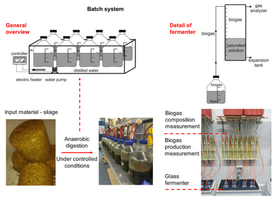 BMP testing was performed in an automated system made specifically for this purpose. The system consisted of batch fermenters (working volume 5 l) placed in a heated water bath. The temperature of the water bath was controlled and kept constant by means of a thermostat. Each fermenter was equipped with its own connection for measuring biogas production and its composition (Figure 2). On the first day of the experiment, all fermenters were filled with 3 L of filtered inoculum. The inoculum came from the agricultural biogas plant in Cejc, Czech Republic. This agricultural biogas plant, which processes corn silage and pig manure (80/20, w/w%), is operated under mesophilic temperature conditions with a hydraulic retention time (HRT) of 80–90 days. Inoculum parameters were TS = 3.8 ± 0.03% and vs. = 72.58 ± 0.09%. Three fermenters in the system were used as blanks to determine the endogenous biogas yield of the inoculum. Each of the three silage samples shown in Table 2 was added to the fermenters in triplicate. The organic matter load was 2.5 g vs. of added substrate/liter of inoculum volume. The temperature during the test was 42 °C ± 0.1 °C. Biogas yield was measured daily using the liquid displacement method (according to VDI 4630); acidified, saturated NaCl solution was used as barrier solution. The volume of biogas produced was brought to standard temperature and pressure (273.15 K and 100 kPa). The biogas composition was analyzed using the Dräger X-am 5600 gas analyzer (Dräger, Lübeck, Germany). All tests were continued until the daily biogas production was less than 1% of the total biogas production for three consecutive days (VDI 4630) or a retention time 35 days was reached.