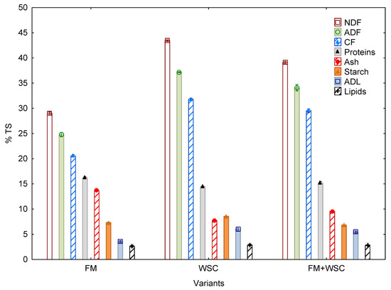 The WSC variant exhibited the highest contents of starch and lipids. The starch content in this variant was 14.5% higher than in the FM variant and 20% higher than in the FM + WSC variant. Compared with results claimed by Kintl et al. [24] for WSC (4.51% TS), the content of starch in WSC in this experiment (8.57% TS) was 90% (4.06 percentage points) higher. The content of lipids in the WSC variant was almost 9% (0.62 percentage points) higher than in the FM variant. Graphical illustration of results from the qualitative analyses of the silage variants’ composition is presented in Figure 3, Table 4 shows significant differences between the individual variants.