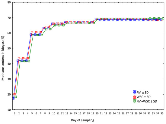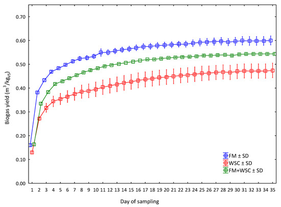 The cumulative production of biogas for 35 days in all three variants is shown in Figure 4. The diagram indicates that the lowest average yield of biogas from the very first day of the measurement was that of WSC silage. The total (cumulative) biogas yield from the WSC silage was 0.47 m3/kgVS. A higher average biogas yield was recorded throughout the measurement in the silage of mixed FM and WSC culture (50:50), with a total yield reaching 0.54 m3/kgVS. The highest production of biogas was recorded in the FM silage variant already from the first measurement. The total biogas yield was 0.60 m3/kgVS. For the 35 days of the experiment duration, 79.1% (WSC) and 85.4% (FM) of total biogas yield was produced in the first seven days. The measured values further indicated that the production of biogas gradually began to stagnate from Day 16 of the measurement, with a final stagnation recorded on Day 25. A similar trend was also observed in other experiments [24,29] where the production of biogas was measured in laboratory conditions using one batch of silage (plant mass). Therefore, a so-called breaking point should be established precisely for practical use and, hence, a moment when a further silage batch has to be added into the fermenter. This is not a problem in the case of silage grown in the MC regime as it exhibited the most continuous curve of biogas production, i.e., a curve with the smallest fluctuations.