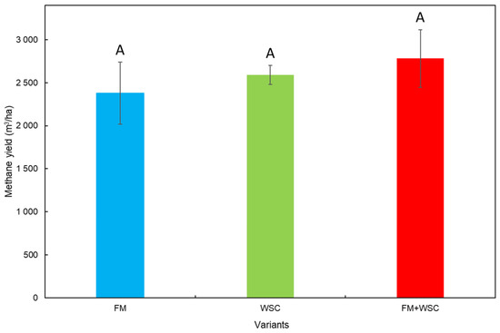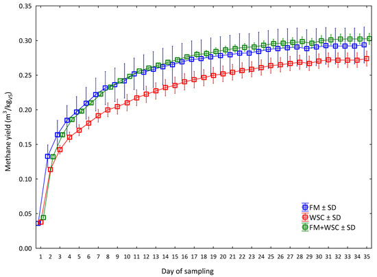 The diagram in Figure 5 shows that the lowest average methane yield was already recorded in the WSC silage on the second day of measurements. The total yield in this variant (Table 8) was 0.27 m3/kgVS. After 21 days, the yield was 0.25 m3/kgVS, which is 56% higher than reported by Kintl et al. [24]—their average yield after 21 days of experiment duration was 0.16 m3/kgVS in WSC. A non-significant, higher average yield was recorded throughout the measurements in the FM silage in which the total average yield reached 0.29 m3/kgVS. The, again, non-significant, highest production of methane was already recorded from the third day of the experiment in the silage from the mixed FM + WSC (50:50) culture in which the total yield was 0.30 m3/kgVS. This was 3% more than the yield recorded in the FM variant and nearly 10% (9.47%) more than the yield recorded in the WSC variant, i.e., on average, 6.2% more than the yield of both monosubstrates. Unfortunately, these differences were not significant (Table 8). The reason was a high variability of measured values, which is also obvious from the range of error bars presenting the size of the SD (Figure 5).