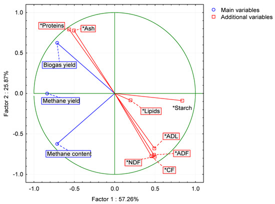 Differences between the yields of respective variants were statistically significant (Table 7). The results indicated that the biogas yield from the FM silage (0.60 m3/kgVS) was statistically significantly higher than the biogas yields from the silage of mixed culture (0.54 m3/kgVS) and WSC (0.47 m3/kgVS). The values do not entirely confirm the hypothesis that the mixed culture of FM + WSC is more suitable for the production of biogas than FM or WSC monocultures. Only in the case of WSC is it possible to theoretically consider its enhanced properties for the production of biogas if grown in the mixed culture. On the other hand, it is relatively interesting that the highest biogas yield was reached in the FM variant in which the highest ash content and a demonstrably lower starch content were recorded compared with the WSC and FM + WSC variants (Figure 4). In contrast, the WSC variant exhibited the highest content of starch and the lowest content of ash and the lowest biogas yield. Based on the generally known information about the biodegradability of ash and starch [43,44,45], it is possible to state that ash adversely affects the yield of biogas while starch affects it positively as it is a source of energy for the microorganisms responsible for biomass degradation during AD [1,2,3]. The cause of this condition can be associated with the content of other substances from the FM and WSC plants in the silage, because the silage produced from FM contained demonstrably less lignin and other vegetable fiber than the silage produced from WSC. Fiber, namely, cellulose, hemicellulose and lignin, is a substance that is difficult to biodegrade [45]. Thus, it is theoretically possible that the lower content of substances with the worse degradability (CF and ADL) contributed to the higher biogas yield from the FM silage compared with WSC and, thus, compensated for the lower content of starch. In contrast, the WSC silage exhibited the highest contents (p < 0.05) of CF and ADL, which could have been the reason for the lowest yield of biogas in this variant. If we look at these values in a greater detail, we can see that the FM variant contained 11% less CF and 2.4% less ADL. The WSC variant contained only 1.24% more starch, i.e., readily degradable substances. It is, therefore, possible that the higher content of readily degradable, carbonaceous substances does not have such an effect compared with the content of worse, degradable substances.