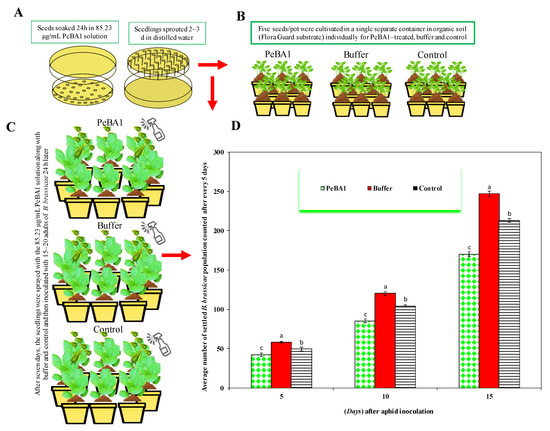 Plants treated with PeBA1, control, and buffer showed B. brassicae population variations. (A,B) Seeds and seedling treatment, (C) after 7 d, seedlings were inoculated with 15–20 adults of B. brassicae, (D) seedlings treated with PeBA1 saw a substantial aphid population loss (mean ± SD), (a–c) the significant differences among PeBA1, buffer and control. The study used a CRD randomized statistical design, LSD and one-way ANOVA were used to compare data (p = 0.05).