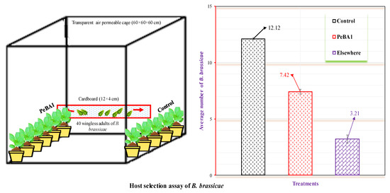 The goal of this experiment was to assess the host selection of B. brassicae. Seeds and seedlings were treated as described in Section 2.3 then seedlings were arranged in a ventilated breathable cage (60 × 60 × 60 cm), with cross-touch leaves and a white cardboard bridge (12 × 4 cm) connecting the base parts of the stems. Forty wingless B. brassicae adults were released into the center of the bridge. The experiment was carried out 15 times. After 24 h, the B. brassicae on each seedling were examined and the number of B. brassicae on each seedling was recorded.