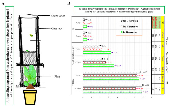 The goal of this experiment was to determine the increase in the intrinsic growth rate of B. brassicae when feeding on PeBA1-treated and control seedlings. Seeds were treated as described in Section 2.3. Each seedling was implanted with a newly emerged B. brassicae nymph. All seedlings were separated by a cotton-gauze-lined glass tube, and aphid movement was restricted on the leaf in a plastic ecological cage (Cangzhou Hengyun Plastic Industry, Cangzhou, Hebei Province China) (2.7 × 2.7 × 2.7 cm). Every 12 h, the B. brassicae instar was tested to determine when it produced its first nymphs. Then, the number of newborn nymphs was counted twice daily to determine the overall amount of time and number of offspring produced, which were removed daily following each count to avoid crowding. The same test was repeated five days later on seeds and seedlings. The experiment was conducted twice with 30 duplicates for each treatment. The rise in the intrinsic rate of each aphid was calculated using the following formula: