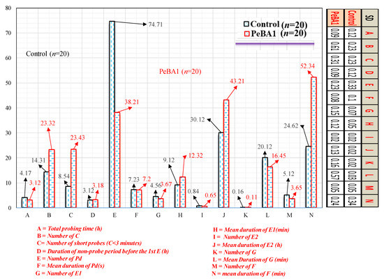 An EPG illustrated that resistance characteristics of the B. rapa. Brevicoryne brassicae feeding patterns in PeBA1-treated seedlings were considerably affected (Figure 4). The probing period, the length of C, and the total value of B. brassicae Pd considerably lowered in the PeBA1-treated seedlings, meanwhile, the period of non-probing before the first E and the total duration of F dramatically increased. During the non-probing period, no electrical contact was detected between the aphid stylet and the plant [39]. The non-probing period before the first E was significantly increased in the PeBA1 treatment, indicating a repellent or deterrent surface factor in the PeBA1-treated B. rapa seedlings. C waves describing style motion may serve as a mechanical barrier in plants [40]. The shorter the C waves (3 min), the greater the mechanical difficulty in PeBA1-treated seedlings. Wave E1 indicated aphid saliva injection into sieve elements. The E2 wave revealed phloem sap injection. The expanded E1 in the sieve element showed additional plugging or defensive chemicals. In the E2 period, however, there were no significant differences between the control and PeBA1 treatments, indicating no or low variability in phloem chemicals to impart resistance to B. brassicae. The F wave time in the PeBA1-treated seedlings, on the other hand, was longer, showing that PeBA1 improved the mechanistic defense. The EPG results revealed that the resistance caused by PeBA1 was mostly related to a change in physical defense.