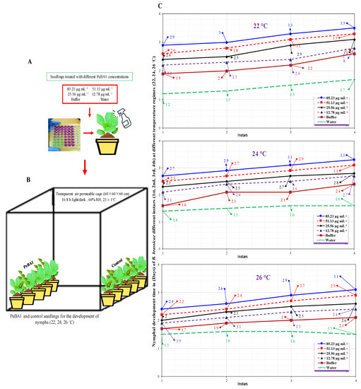 Mean developmental time (± SE) of B. brassicae nymphal instars on B. rapa plants in varying concentrations at 22, 24, 26 °C (n = 10). Seeds and seedlings treatment and preparation for inoculation B. brassicae (A,B). Nymph development time prolonged in treated seedlings compared to control, (C). Data were compared statistically using a factorial ANOVA and the least significant difference (LSD) at α = 0.05.