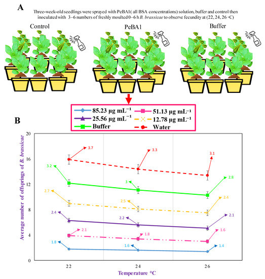 The study aimed to calculate the average size of the settled B. brassicae population. Brassica rapa seeds and young seedlings were immersed in 85.23 μg mL−1 of PeBA1 solution for 24 h. Five seeds/pot were cultivated separately in organic soil (Flora Guard substrate). After seven days, the B. rapa seedlings were sprayed with the 82.64 μg mL−1 PeBA1 solution then inoculated with 15–20 adults of B. brassicae 24 h later. Seedlings were sprayed every 7 days. Following inoculation, the number of settled aphids was counted every 5 d [25]. The data fractions were used for data analysis and the conclusion of results. Controls and negative controls were treated with water and 85.23 μg mL−1 of a buffer (50 mM Tris-HCl, pH 8.0), respectively. Transparent air-permeable cages were used to isolate seedlings. The experiment was performed twice with four replications.