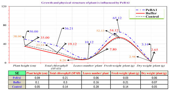 This study aimed to determine the effect of PeBA1 on the physical structure of B. rapa. Seeds and seedlings were treated as discussed in Section 2.3. The initial leaves’ core sections were removed and analyzed, and samples were taken for up to 2 days using 3.5% glutaraldehyde mixed in a 0.1 M phosphate solution (pH 7.2). All samples were washed for about 15 min in a 0.1 M phosphate buffer (pH 7.2) before being submerged in 1% osmic acid five times for roughly 2 h each. An ethanol gradient of 100%, 95%, 90%, 80%, 70%, 60%, 50%, and 30% was used for 15 min. A Leica EM critical point dryer (CPD030; Leica Biosystems, Wetzlar, Germany) was used to dry all critical points. A Hitachi H-7650 transmission electron microscope (Hitachi, Ltd. Kabushiki Kaisha Hitachi Seisakusho, Tokyo, Japan) was used to examine all materials. To assess the effect of PeBA1-treated settlements, total plant height (cm), total chlorophyll amount (SPAD), total fresh and dry weight, and the number of plant leaves were evaluated in 10 replicates.