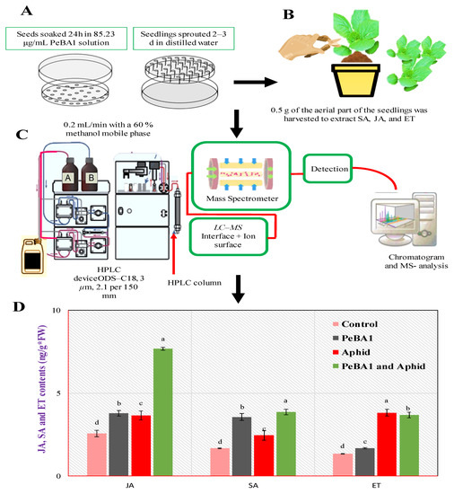 Seed and seedling treatment (A), aerial part of seedling was harvested to extract JA, SA, and ET (B). JA, SA and ET contents in B. rapa seedlings (mean ± SD) (C,D). PeBA1-treated tests were gathered 1 d after the spraying. Aphids were inoculated on seedlings 1 d after they were sprayed with treatment, and samples were collected 1 d after they were inoculated, (a–d) are significant differences among treatments and control, Data were compared statistically; the LSD, ANOVA, and Leven’s test were employed by Statistix version 8.1. (p = 0.05).