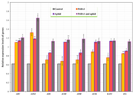 The defense mechanisms in seedlings of B. rapa were enhanced by PeBA1. The genes AOC, LOX2, AOS, ACS8, AIMI, ACS6, KAT2, and 4CL were chosen as test genes [23,25,26]. All the genes were slightly upregulated by treatment with PeBA1 and aphid infestation (Figure 9). The highest expressed gene was LOX2, followed by AOC, AIMI, ACS8, KAT2, AOS, ACS6, and 4CL. The Log2 of all JA, SA, and ET test genes was computed with fold change expression values Table 3.