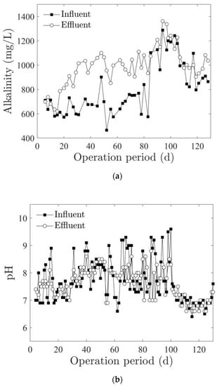 3.1.2. Variation of Alkalinity and pH of the Wastewater