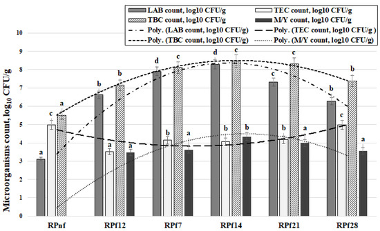 As can be seen from Figure 7, the number of lactobacilli in fermented RP samples had a tendency to increase from 12 h of fermentation up to 21 days and then decreased slightly but remained high enough on day 28. This means that the Lactobacillus strains used for RP fermentation are able to survive, multiply, and maintain homeostasis in fermented meal for a prolonged period.