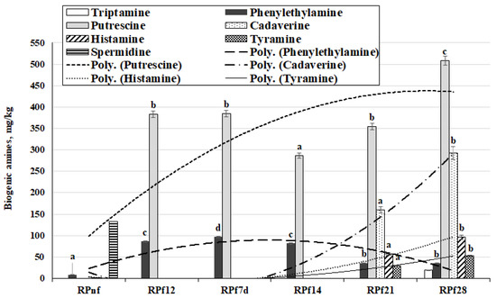 The BA content in RP samples is shown in Figure 4. Tryptamine was found only in one sample (after 28 days of fermentation: 18.8 mg/kg). Phenylethylamine was found in all the tested RP samples; however, the average content of this BA was 8 times higher in fermented samples than in non-fermented samples. Additionally, comparing samples taken after 12 h and 7 and 14 days of fermentation with those taken after 21 and 28 days of fermentation, the earlier samples showed 2.5 times lower phenylethylamine concentration (average of 35.2 mg/kg). Putrescine was found only in fermented samples, at 383 mg/kg after 12 h, then a similar value after 7 days (384 mg/kg) and the lowest value after 14 days (287 mg/kg). However, after 21 and 28 days of fermentation, the average putrescine contents in RP samples increased (in comparison with samples fermented for 14 days) by 19.2% and 43.5%, respectively. Cadaverine, histamine, and tyramine were found at two sampling points, after 21 and 28 days of fermentation, with higher concentrations of these BA being found in samples fermented for 28 days (averages of 45.4%, 40.6%, and 44.2% higher, respectively). In contrast to cadaverine, tyramine, and histamine, spermidine was established only in non-fermented samples (132 mg/kg), and no spermine was found in RP samples.