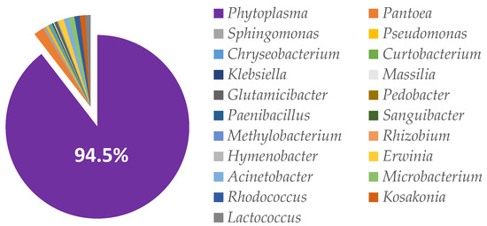 The bacterial profile of rapeseed meal before the fermentation is given in Figure 5. Before fermentation the most predominant genus in rapeseed meal content was Phytoplasma (94.5%). It was detected in 11,646 reads of Phytoplasma from the total of 12,329 bacterial reads. The second most prevalent genus was Pantoea (1.9%). The amount of any other bacterial genera in rapeseed meal was below 0.6%, as presented in Figure 5.