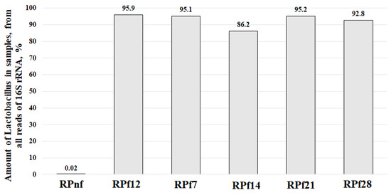 As can be seen in Figure 6, the amounts of lactobacilli during different time periods were very similar, except for day 14, when there was an obvious decrease in their percentage. This can be explained by the analysis of the DNA reads (Supplementary File S4), which shows an increased percentage (6.8%) of plant (Brassicaceae) DNA detected together with bacterial DNA and included in the presented data. The amounts of lactobacilli detected 2 weeks before and 2 weeks after day 14 demonstrate the stable and high amounts of Lactobacillus spp. in samples. The prevalence of other bacteria in all fermented samples during all experiments was very low, with the highest being for bifidobacteria (2.19%), which were detected on day 28 of RP fermentation (Supplementary File S6).