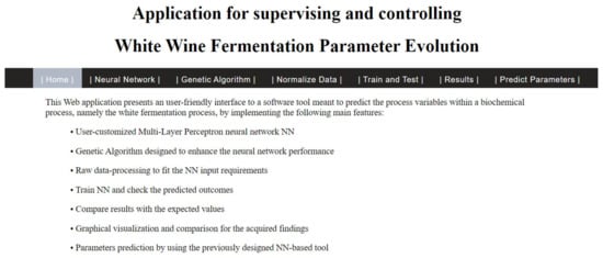 http://webspace.ulbsibiu.ro/adrian.florea/html/simulatoare/WineFermentationPrediction.zip (accessed on 20 February 2022)) and downloaded to local computers by any interested parties. We recommend using Windows 10 or a later version. Further details about the software’s use are provided by the README.txt file in the archive. This software application was developed using the full Visual Studio license provided for academic use, free of charge, by the Lucian Blaga University of Sibiu, with the full support of the Hasso Plattner Foundation in Germany. For this reason, those who use our source must do so only for educational purposes. Besides it being free and easy to use, our tool provides the following advantages: flexibility, extensibility, interactivity, and performance.