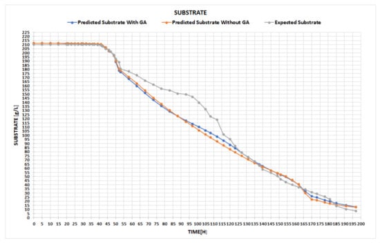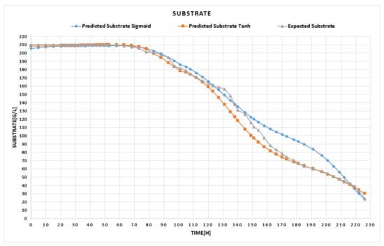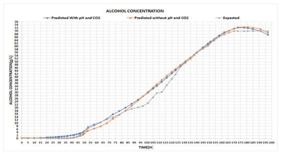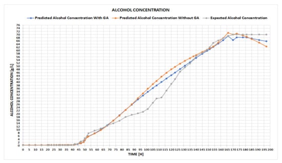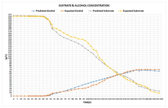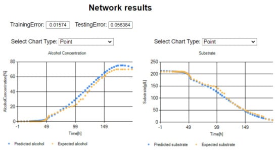 Figure 6 highlights the expected ascending curve of alcohol generation, versus the one predicted by our network in the testing phase. The right-hand chart displays the expected quantity of the consumed substrate in time, compared to the one attained within the testing period. The user can switch between different chart types, for instance, by point, line, bar, column, or area, the main idea being to select the particular type of chart that better emphasizes the visual differences between the data. With all these facts being given, the expert can now conclude whether the results are satisfactory or not. If yes, the final step is to use the obtained tool for the prediction process of the fermentation parameters, as the example in