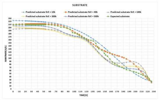 The bioreactor has been equipped with sensors and analyzers to monitor pH, temperature, level and stirred speed control, dissolved O2, and the released CO2 and O2. From the obtained experimental data, based on the domain knowledge of the authors, 30 “representative” sets were used, considering the following contexts obtained from a combination of variables: 210 and 180 g/L as the initial concentration of the substrate, 0.1 g/L as the initial concentration of the biomass, the four mediums, and the four temperatures.