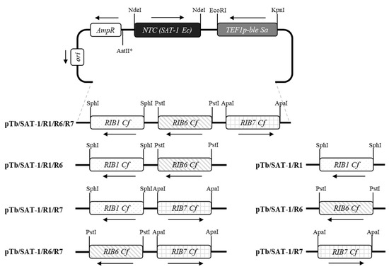 Circular scheme of plasmids pTb/SAT-1/R1, pTb/SAT-1/R6, pTb/SAT-1/R7, pTb/SAT-1/R1/R6, pTb/SAT-1/R1/R7, pTb/SAT-1/R6/R7, and pTb/SAT-1/R1/R6/R7 for co-expression of C. famata RIB genes. All plasmids had the same plasmid backbone containing SAT-1 gene conferring resistance to nourseothricin and indicated as a black box, and gene ble under control of TEF1 promoter from C. famata conferring resistance to phleomycin and indicated as a dark grey box. The RIB1 gene is presented as a dotted box, RIB6—as a striped box, and RIB7—as a square grid box, * AatII—plasmid linearization enzyme.