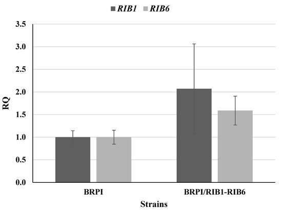The expression of the RIB1 and RIB6 genes was analyzed by qRT-PCR in BRPI/RIB1-RIB6. It was found that the expression profiles of RIB1 and RIB6 were 2.1-fold and 1.6-fold increased as compared to that of the parental strain, respectively (Figure 2).