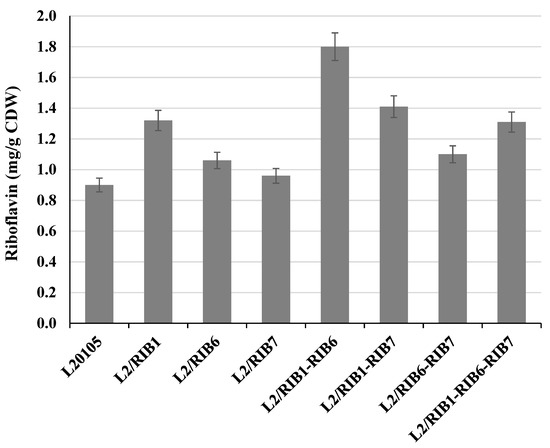In this work, we explored the impact of RIB1, RIB6, and RIB7 genes on riboflavin production. It was shown that among strains expressing single genes, the highest increase in riboflavin yield was fixed for strain L2/RIB1, reaching 47% when compared to the parental strain (Figure 3). The constructed strains L2/RIB6 and L2/RIB7 revealed a less pronounced 18% and 7% increase in riboflavin yield as compared to that of L20105 (Figure 3).