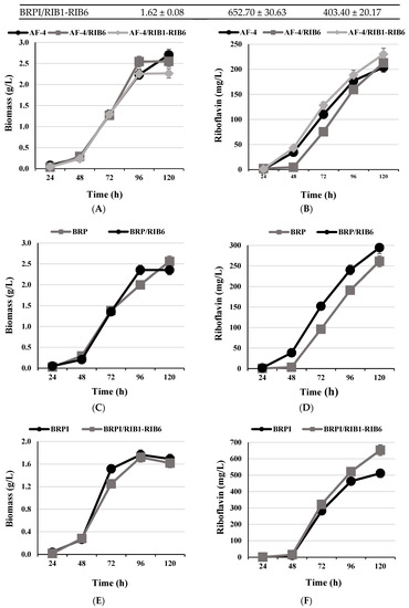 BRP strain derivative of AF-4 harboring additional copies of RIB1, RIB7, and SEF1 genes [19] was transformed with a plasmid containing the gene RIB6. As the result, the BRP/RIB6 strain accumulated around 8% less biomass when compared to the parental strain (Table 1, Figure 4C), while riboflavin production and riboflavin yield were increased by 13% and 23%, respectively (Table 1, Figure 4D).