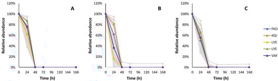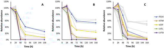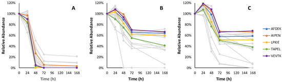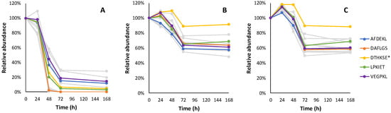 | Peptide Candidate | Retention Time (min) | Observed m/z | Charge | CCS (Å2) | Average Original Intensity | RSD | Lalvin ICV Opale 2.0™ (Consumption, %) | Lalvin Persy™ (Consumption, %) | Lalvin QA23™ (Consumption, %) |