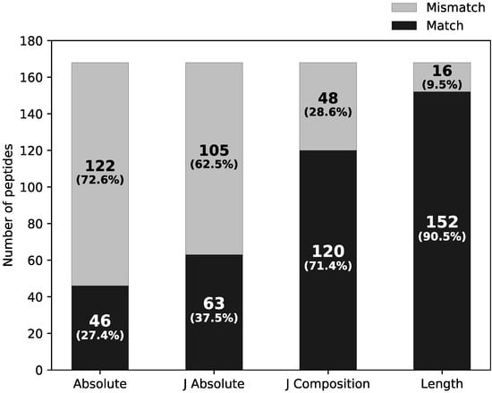 - Liigand, P.; Kaupmees, K.; Kruve, A. Influence of the amino acid composition on the ionization efficiencies of small peptides. Biol. Mass Spectrom. 2019, 54, 481–487. [Google Scholar] [CrossRef] [PubMed]
