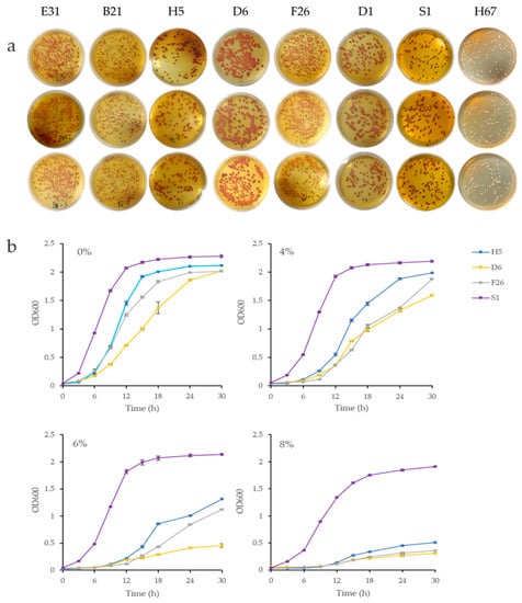 The TTC medium chromogenic method was employed to examine the red color intensity of 85 non-Saccharomyces strains. The results demonstrated that the chromogenic levels of the strains were significantly different. The strains B21, D1, D6, F26, E31, and H5 displayed a prominent dark red color and had better consistency between the three parallel. Commercial Saccharomyces cerevisiae S1 was used as a positive control, and the strain H67 was used as a negative control. The colorimetric results are shown in Figure 1a. Although the TTC medium method could quickly screen out the strains displaying better color, quantitative evaluation was impossible; therefore, six selected yeasts were utilized in the follow-up study to determine their tolerance at different ethanol concentrations. As shown in Table 1, strain D1 exhibited the worst ethanol tolerance and only proliferated at a 4% ethanol concentration. Strains B21 and E31 showed good tolerance of a 6% ethanol concentration. The strains displaying the highest ethanol tolerance were F26, H5, and D6, which could form colonies on the medium containing 8% ethanol.