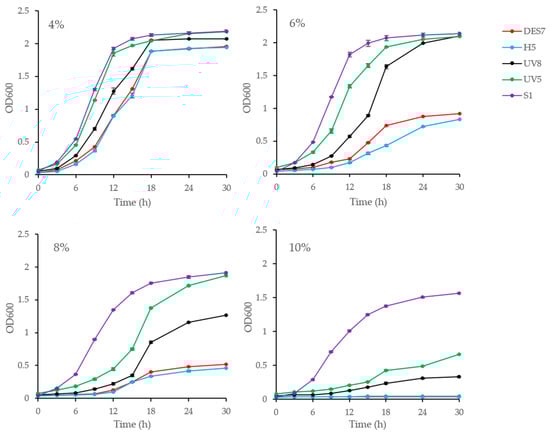 The growth curves of the mutants at ethanol concentrations of 4%, 6%, 8%, and 10% (v/v). Strain H5 and S1 served as controls at various ethanol concentrations.