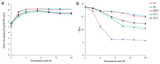 The yeast cell dynamics during the fermentation process are shown in Figure 4a, while the °Brix change is shown in Figure 4b. As shown in Figure 4a, the yeasts continued to proliferate as the fermentation progressed, reaching their maximum count at 7 d and maintaining high cell viability until the end of the process. The °Brix value results showed that neither strain H5 nor the three mutants could fully utilize the sugar content in grape must.