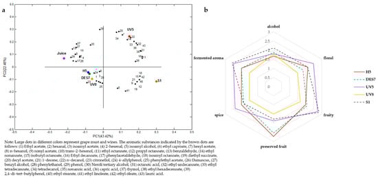 (a) PCA of selected volatile compounds in Cabernet Sauvignon must and wine; (b) the aroma radar map of the sensory evaluation.
