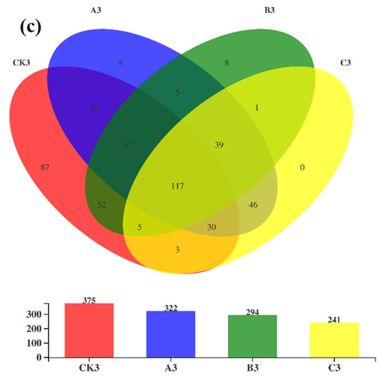 There were 946 OTUs in the three periods of Group B, as shown in the Venn diagram, accounting for 22.91% of the total OTUs. Groups CK1, A1, B1, and C1 had 289 OTUs each during the thermophilic stage, indicating similar microbial composition during the mesophilic stage of compost. Thermobifida in Actinobacteriota was high, accounting for 6.91% of the total similarity ratio (Figure 3a). In the thermophilic composting stage, 150 OTUs were identified in the four composting groups, and 78 OTUs were identified in the inoculated groups A2, B2, and C2 (Figure 3b). Sphingobacterium in Bacteroidota accounted for 9.34% of the total similarity ratio of Groups A3, B3, and C3. In the cooling stage of composting, there were 117 OTUs in the four composting groups, among which Psychrobacillus in Firmicutes was predominant (Figure 3c), accounting for 18.66% of the total similarity ratio.
